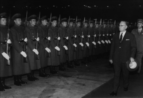 Миомир Б. Лазаревић (1948.), трећи слева, у почасном строју гарде за дочек председника Ј. Б. Тита (фото 1967.)