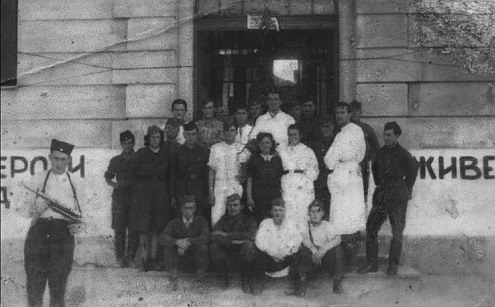 Регрутовање нових војника ЈА, испред Дома културе у Стрижи. У првом плану су Александар Драгомира Савић и Владимир Живковић. (фото 1951.) |